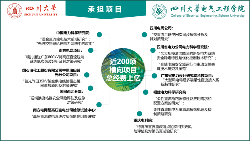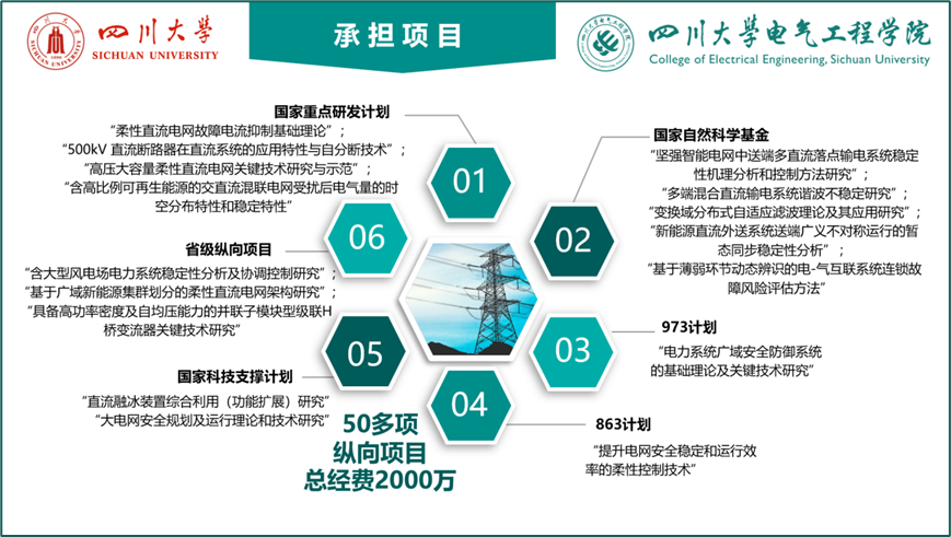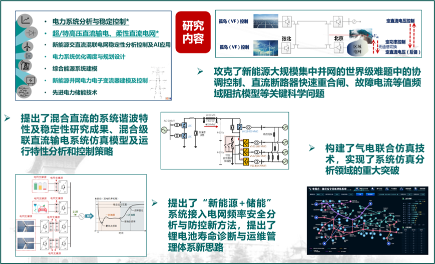 团队深耕细作,刻苦钻研。研究领域包括:电力系统分析与稳定控制、特/超高压直流输电、柔性直流输电、新能源交直流混联电网稳定性分析控制及AI应用、电力系统优化调度与规划设计、综合能源系统建模、新能源并网电力电子变流器建模及控制、先进电力储能技术等。团队承担了包括国家重点研发计划、863计划、973计划、国家自然科学基金、国家科技支撑计划项目等50多项国家级、省部级纵向项目,总经费超过2000万;和国家电网公司、南方电网公司以及各省网公司及设计院等单位合作近200项协作项目,总经费超过1亿元。团队有效服务国家能源战略需求,推动清洁能源的高效开发和利用,占领直流电网领域学术高地,推进先进直流输电技术在工程项目中的应用,积极为经济社会事业作贡献。团队研究成果应用于世界首个柔性直流电网工程——张北柔性直流电网工程、两个世界级特高压混合直流输电工程——乌东德送电两广直流工程和白鹤滩混合级联直流送出工程、多个省级电网;出版近20本中英文专著,1本译著,发表SCI论文近300篇,EI论文400多篇,高被引论文多篇,获得专利200多项;获中国电力科学进步奖一等奖,中国电力创新奖一等奖,全国优秀工程咨询成果一等奖2项,省部级奖9项,电力科技进步奖2项,其他科技奖励5项。