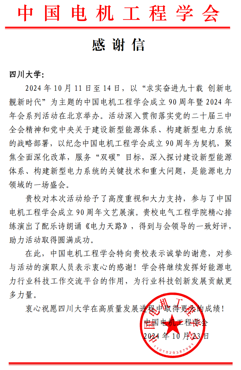 中国电机工程学会向学校和参与活动的两位教师对本次活动的大力支持致感谢信,表达了诚挚的谢意,并表示将发挥好能源电力行业科技工作交流平台的作用,为行业科技创新发展贡献更多力量。同时衷心祝愿探花视频