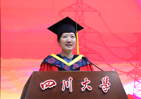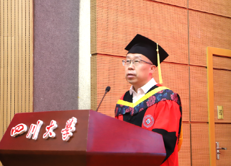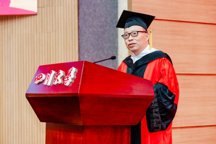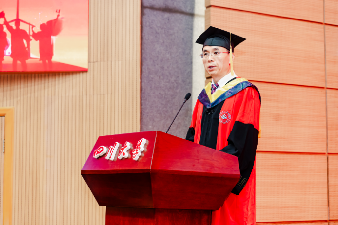 的全体毕业生顺利完成学业、走上新的人生征程表示祝贺。他在致辞中以2025的特殊寓意切入,希望大家始终充满爱党爱国爱川大的真挚情感。他借用学校法学教育创办人邵从恩老先生的名言“内本着良心,上看到国家,下看到百姓”,寄语毕业生要向善而行、向上而行、向人民而行。站在强国建设的关键点上,站在人生发展的转换点上,我们要永远与伟大时代同行,为探花视频