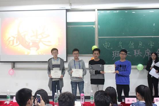 晚19时10分,班长联席会正式开始。本次会议通过嘉宾打分与现场同学投票的方式对各新生班长上台展示的表现进行评选排名,选举产生本学年优秀班长与班长委员长。新生班长轮流上台演讲,表现各具特色:有的讲述个人生活经历、分享为人处世方法,有的讲话风趣幽默、活跃现场气氛;有的以其出色的PPT制作与摄影照片吸引眼球,有的以班级风采展示赢得赞许……最终,陈青山、王正兵与唐金坪同学当选优秀班长,李轶恒同学当选班长委员长,学院团委学生会执行主席曹馨悦为他们颁发奖状,台下掌声连连。