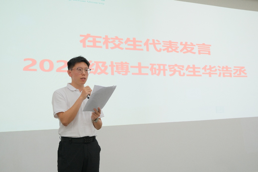 在校生代表、2022级博士生华浩丞结合自身求学经历,向新同学分享了真挚的成长建议。他说,真正的成长不仅来自于个人的坚持,更源于与他人的合作和集体的支持。面对科研困境应保持开放心态,积极与外界沟通协作,在交流中激发思路、凝聚力量,从而在不确定中找准方向,在压力下创新有为,最终走出有意义的研究之路。