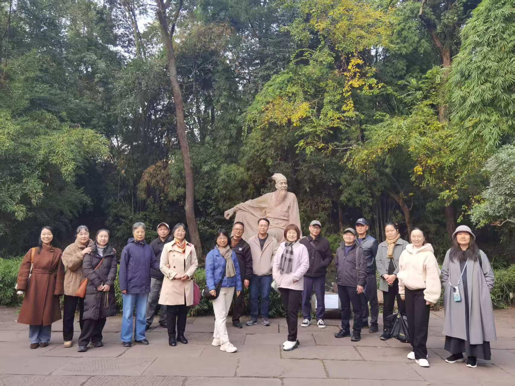 随后,党支部一行前往本次活动的第二站——三苏祠。在专业讲解员的引导下,党员们沿着三苏祠的青砖黛瓦,依次参观了大殿、启贤堂、来凤轩等历史建筑,深入了解了苏洵、苏轼、苏辙的生平事迹、文学成就以及流传千年的家风家训。祠内珍贵的文物、古朴的陈设与厚重的历史氛围,让大家深刻感受到了“一门三词客,千古文章事”的文化底蕴,也对三苏父子在文学创作与为人处世中所秉持的精神品格有了更为深刻的理解。