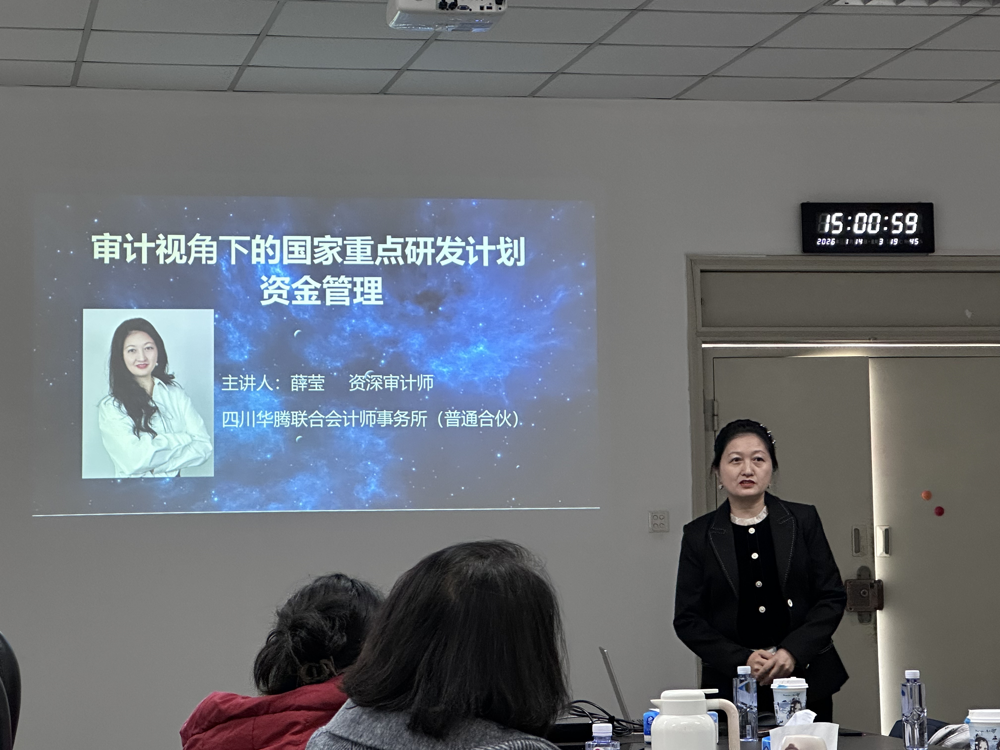 邀请了四川华腾联合会计师事务所资深审计师薛莹在基础教学大楼A220进行了专题讲座,讲座名称为“审计视角下的国家重点研发计划资金管理”。