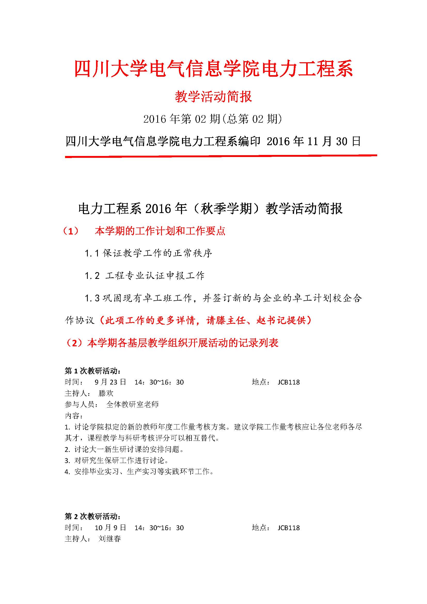 电气工程及其自动化2016年(秋季学期)教学活动简报