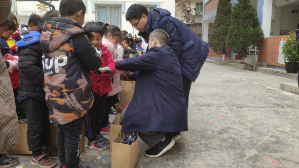 在活动现场,肖先勇院长同小朋友们进行了互动交流,用自己的成长经历勉励他们克服困难,走出大山,自信自强,刻苦学习,健康成长,争做有梦想、有行动的好少年。活动仪式上,老师们及志愿者向小朋友们发放了手套、帽子、袜子等组成的礼包,并教授他们常用的礼貌用语。收到礼包的孩子们十分高兴。