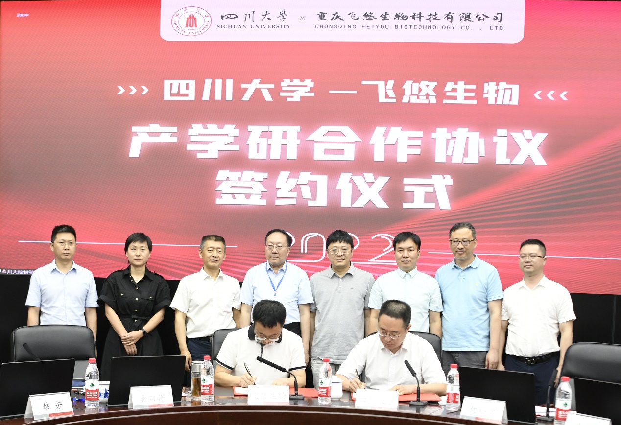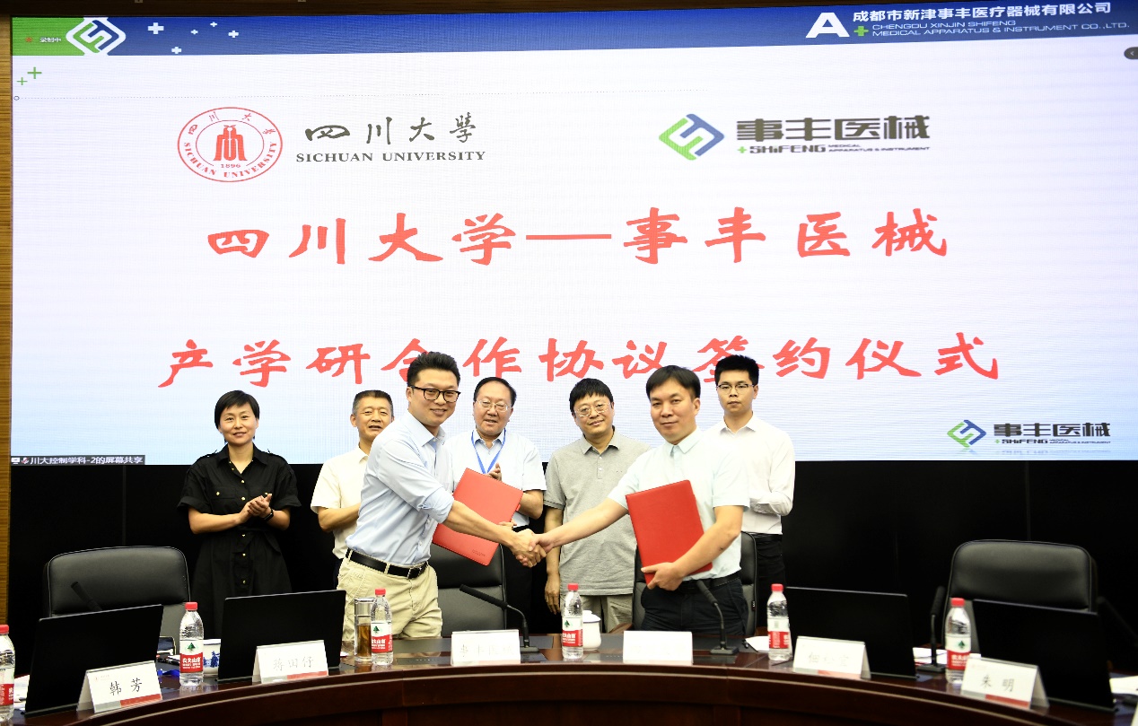自动化系党支部书记刘念和系主任佃松宜代表学院分别与重庆飞悠生物科技有限公司董事长邵文陶和成都市新津事丰医疗器械有限公司运营副总经理石明阳签订了产学研合作协议。