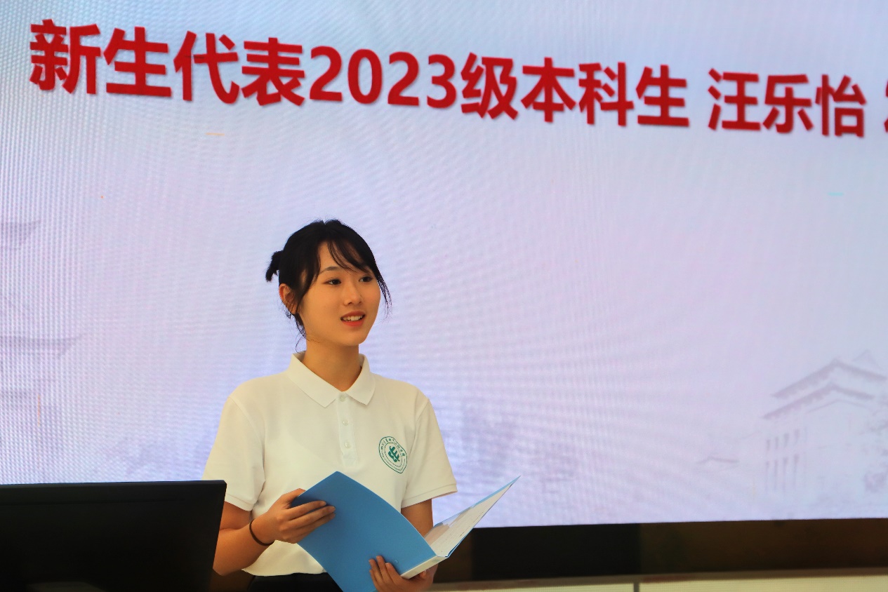 2023级本科生汪乐怡作为新生代表发言。汪乐怡同学表达了自己对大学生活的无限憧憬,以及对学院的信心。她指出,川大志愿者在“大运会”上的辛勤付出,是践行“海纳百川,有容乃大”校训的生活体现,深刻展现出“川大人”的赤忱与热情。肖院长、雷院士、张教授以及学长的分享进一步加深了新生对学院及本专业的认识,描绘了大学生活的蓝图,更加坚定了未来成长成才的信念与信心。她表示,全体同学将谨遵前辈们的嘱托与期望,心怀“国之大者”,坚毅奋斗,锐意进取,勤勉奉献,将目光放在最前沿,知晓学无止境,勇攀知识高峰。