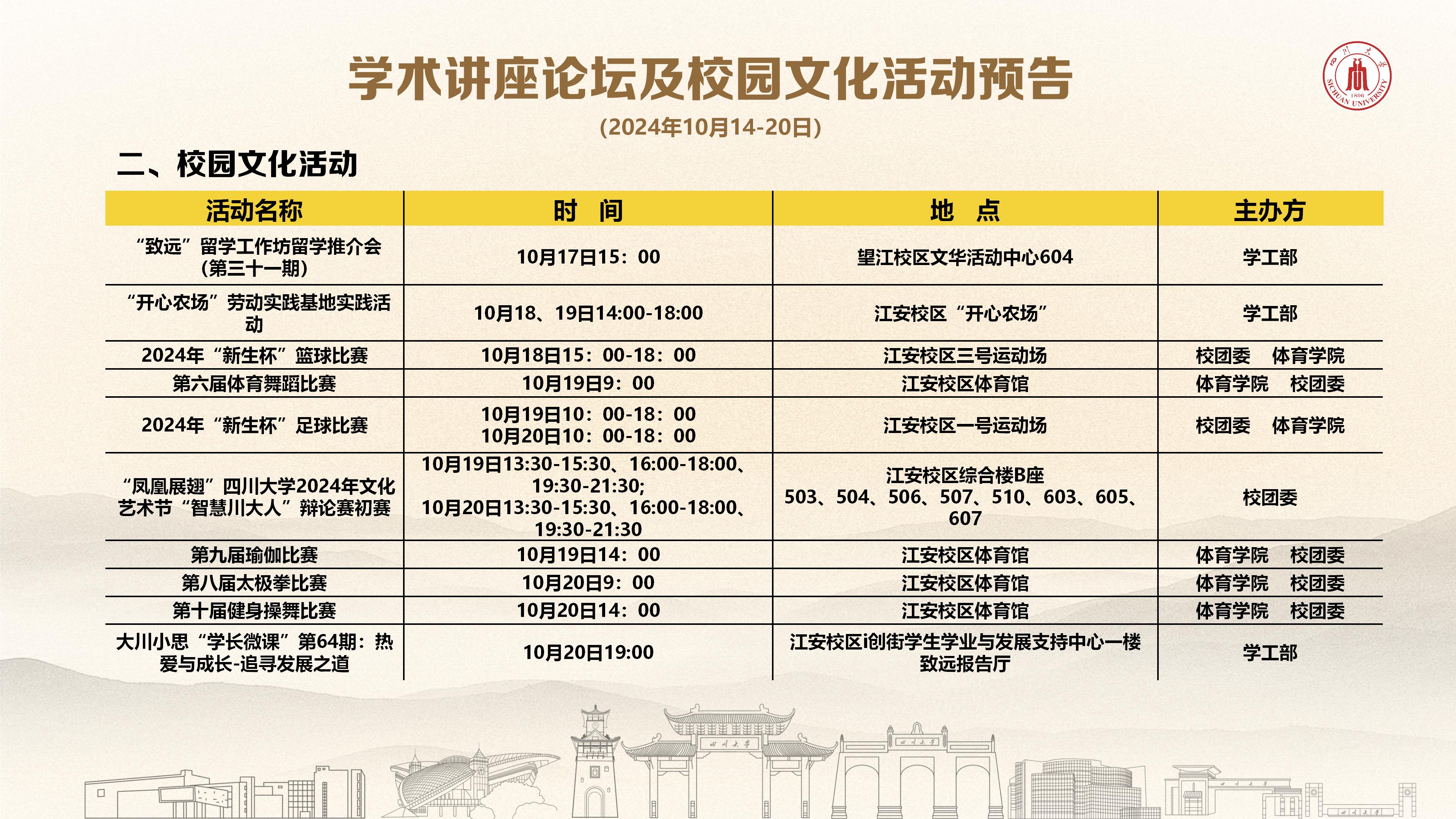 探花视频 2024年10月14日-20日学术讲座论坛及校园文化活动预告