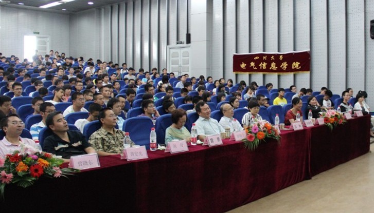 电气信息学院院长刘俊勇教授首先向12级新生的到来表示衷心的祝贺,幽默地谈及了当代大学生对大学应具有的认识,提出大学是一种重要的体验,是思考人生,培养能力的重要时期。刘俊勇院长多次引用谢和平校长的话,“你可以不伟大,但你一定要有崇高的目标。”告诫我们面临挫折和坎坷时,要坚持自己的梦想,不断拼搏,不断奉献。此外,刘院长简要介绍了学校及学院的概况,并向同学们讲述了优秀校友们的辉煌成绩和成长经历,以此勉励同学们珍惜在川大的美好时光,继承电气信息学院的优良传统,努力学习,奋勇拼搏,将来为电气、为川大、为我们的祖国赢得更大的荣耀。