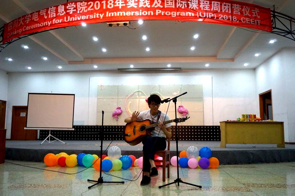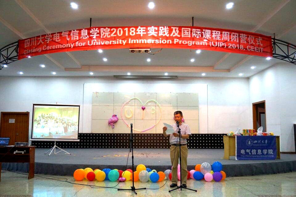 2018年7月19日晚上19:30,电气信息学院2018年国际课程周闭营仪式在望江校区学生活动中心举办。出席本次闭营仪式的有电气信息学院肖先勇院长、李长松副院长、王晓芳老师、邓清华老师、姜小雨老师以及国际交流营全体营员。