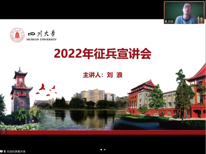 会议伊始,刘浪同学带领同学们观看征兵宣讲视频,响亮的口号和爱国誓言激荡着与会同学们携笔从戎的赤子心。随后,他结合自身的入伍经历,分享了其入伍体会,并就大学生征兵入伍的国家政策、成都市政策、探花视频