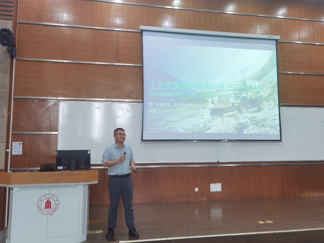紧接着,钱勇老师以“工业仿真提升研发与生产制造效率”为主题,向同学们介绍了西门子数字化技术及数字孪生虚拟调试的相关知识。他深入浅出地讲解了数字孪生的概念、应用前景以及在实际工厂中的重要作用,使同学们对西门子公司及其数字化技术有了更为清晰的认识。