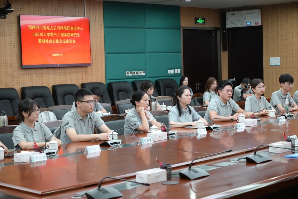 上午10时,实践团一行16人同国网四川省电力公司特高压直流中心主任、党委副书记文曹,直流中心党委组织部(人力资源部)主任朱业以及运维部相关负责人举行校企访谈交流座谈会。交流会由朱业主任主持,朱主任首先对我院与直流中心长期以来良好的校企互动和交流给与了充分的肯定,同时对参与此次暑期实践活动的师生表示热烈欢迎。