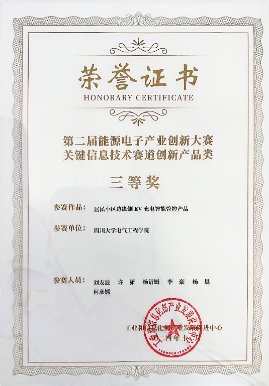 在关键信息技术赛道,由刘友波教授、许潇副研究员联合指导,杨语嫣(2023级博士研究生)、李豪(2024级硕士研究生)、杨晨(2024级硕士研究生)、何彦嬉(2023级本科卓工班)同学参与设计研发的“居民小区边缘侧EV充电智能管控系统”荣获三等奖。参赛团队针对居民负荷高峰或电动汽车充电同时率高时,小区台变、近端馈线动态容量不足的问题,基于预测控制与人工智能融合技术,研制了云边端协同的居民小区有序充电边缘智能柔性控制装备及系统。