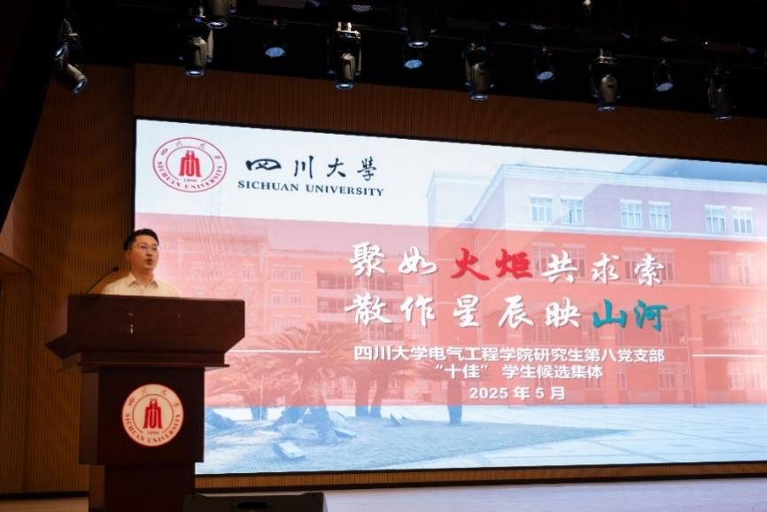 2022级硕士研究生黄龙作为集体负责人以“聚如火炬共求索,散作星辰映山河”为主题,在“十佳”学生集体评选答辩现场进行了精彩展示,从多个维度全面展现了党支部的成长历程与精神风貌,生动诠释了川大电气青年的责任担当与奋斗风采。