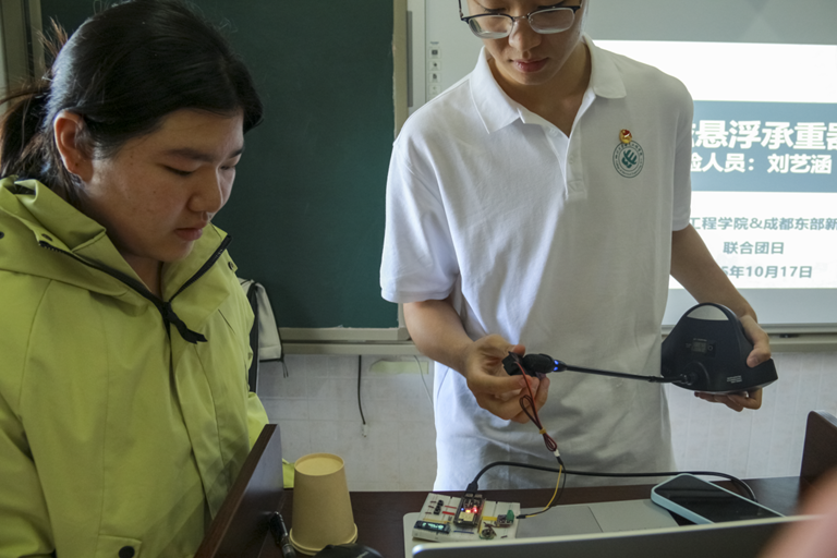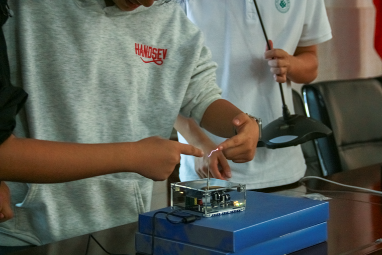在实验演示环节,李瑞同学用“空气炮”展示了能量转换的奇妙过程;张钰清同学带来了基于ESP32的单片机小智机器人,展现了AI人工智能的魅力;刘艺涵同学通过“磁悬浮承重器”揭示电磁学的神奇奥秘;丁尚磊同学以特斯拉线圈的放电试验进行“安全用电”演示,在惊叹声中为同学们普及科学用电知识。每一个实验都融汇了科学趣味与工程思维,互动热烈,掌声不断。