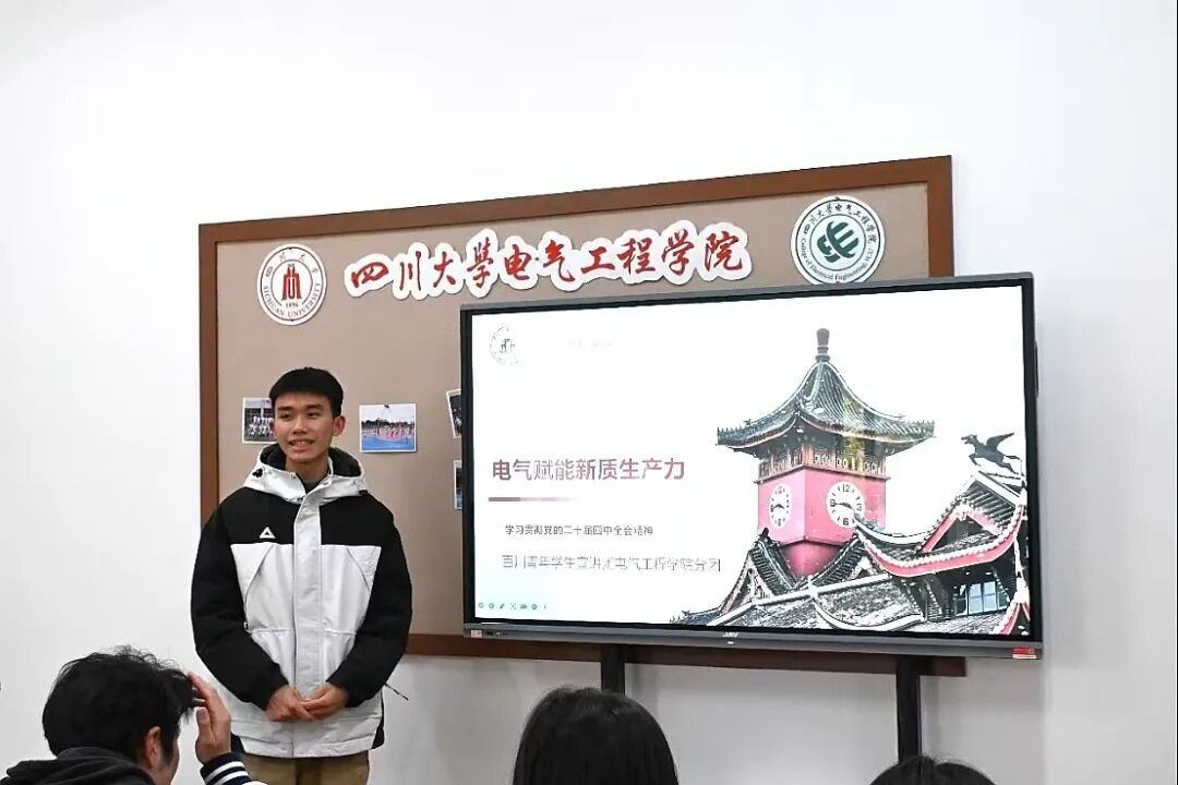 百川宣讲团成员研究生团支部宋馨月、本科2024级团支部卿朗宁和蒋翀同学开讲。三位宣讲人锚定“建设现代化产业体系”国家战略,以“理论解读”和“实践指引”为脉络,解读新质生产力“高科技、高效率、高质量”核心内涵,阐明电气工程“智能化、绿色化、融合化”属性,及其在智能电网、特高压输电等工程中的关键作用与战略价值。