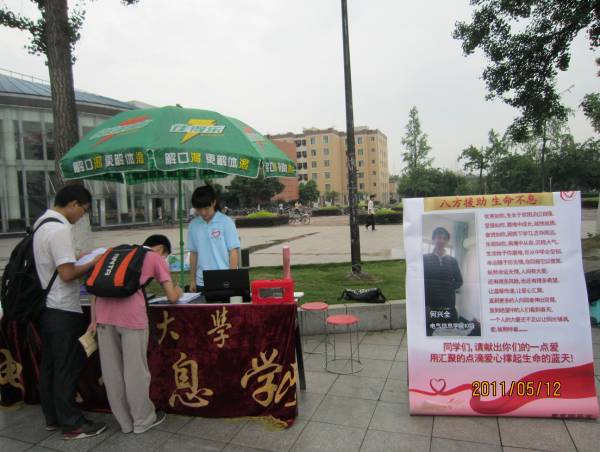 电气信息学院为2010级贫困罹病何兴全同学举行的爱心募捐活动于望江、江安校区同时进行。电气信息学院党委副书记韩芳老师,分团委书记戴婷婷老师,各年级辅导员老师分别来到望江校区和江安校区的募捐现场参与其中。