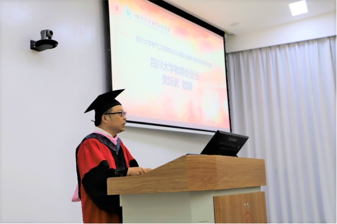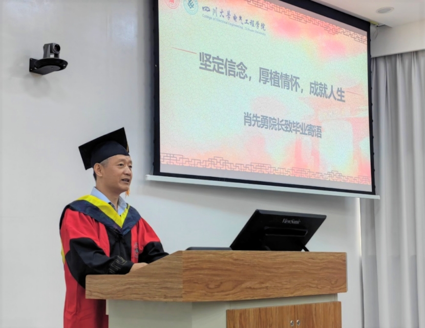 院长肖先勇教授为所有毕业生送上题为《坚定信念,厚植情怀,成就人生》的毕业寄语。肖院长对同学们提出三点希望:一是坚定信念,心中有梦。希望同学们坚定理想信念,始终心中有梦,将个人理想与祖国前途、民族命运紧密联系起来相连,在建设伟大祖国中成就更加优秀的自己。二是守正奉献,眼里有光。肖院长鼓励同学们把所学专业知识和所培养的创新能力,更多用于服务国家需要,服务社会,服务地方经济。三是砥砺奋进,大器天下。肖院长勉励同学们继续保持砥砺奋进,大器天下的底色,永远“做想不优秀都不可能”的川大电气人。希望大家永葆川大气质,永葆川大电气本色,把川大精神、电气气质发扬光大,并通过同学们在未来的人生道路中把川大精神、川大气质用于服务国家、奉献时代。最后,肖院长表示探花视频