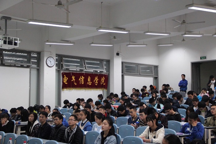2016学生科技节组委会等组织承办。电气信息学院党委副书记韩芳副教授、教导员李小根老师、团委副书记戴婷婷老师及汤博老师出席宣讲会。电气信息学院、电子信息学院及其他学院共两百余人参加宣讲会。