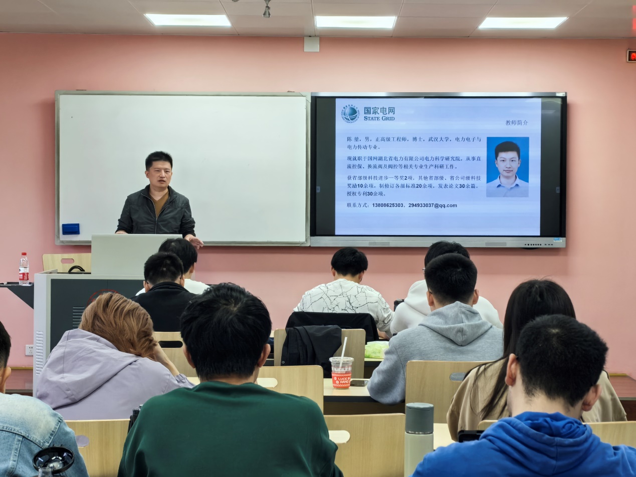 2021级电气工程及其自动化专业卓工班电气工程前沿探讨课企业技术专家进课堂——柔性直流输电技术及其工程应用,在基础教学楼顺利开展。本次讲座由来自国网湖北省电力有限公司电力科学研究院的相关专家陈堃老师主讲,学院王顺亮老师主持,卓工班全体学生参与。