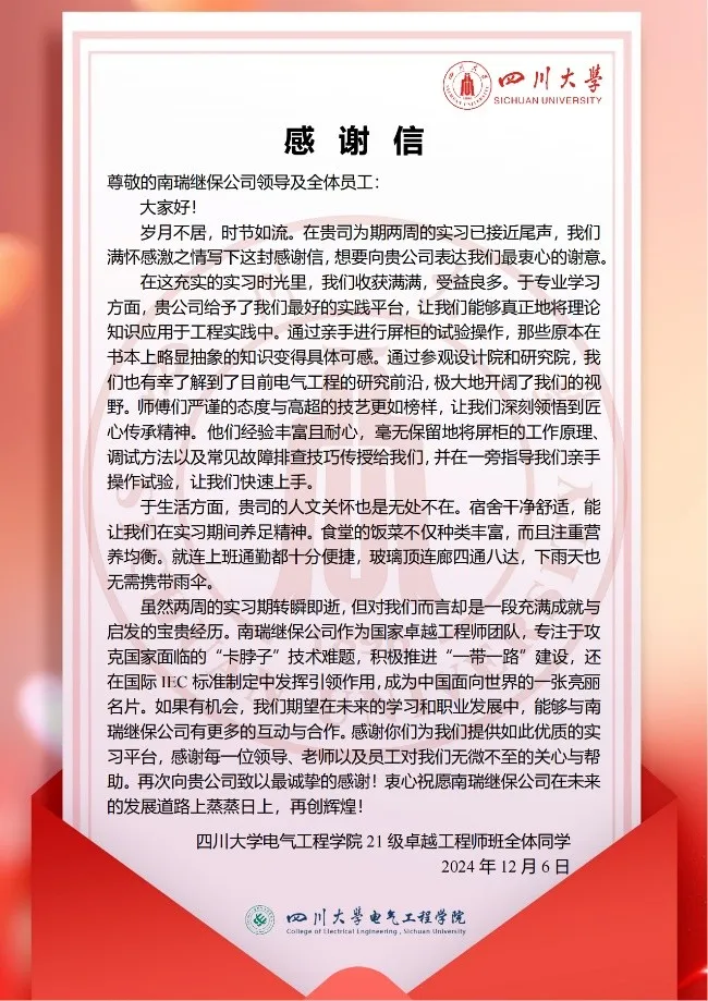 卓越工程师班南瑞继保实训结营仪式正式启动。出席结营典礼的有南瑞继保培训中心和工程服务中心的刘志、马文见、刘志刚领导,川大电气优秀前辈代表夏冰学姐、崔敏学长,探花视频