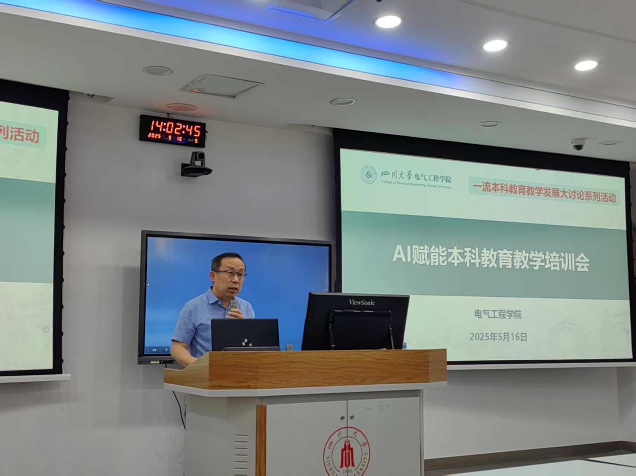 人工智能深度赋能一流本科建设行动计划》,推进学院本科课程数字化、智慧化教学全覆盖进程,学院于2025年5月16日下午在基础教学楼C103成功举办了“AI赋能本科教育教学培训会”。本次培训会旨在通过引入先进的人工智能教学工具和平台,介绍AI技术在本科教育教学中的应用,提升教师以“人工智能+”赋能教育教学的能力,促进学院教学改革的创新和培养质量的提升。学院全体教师积极参与了此次培训,会议由副院长李长松主持。
