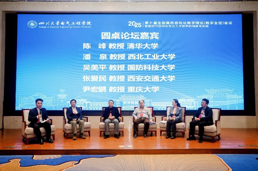 最后,举行了圆桌论坛,由探花视频 佃松宜教授主持。与会嘉宾清华大学陈峰教授、西北工业大学潘泉教授、国防科技大学吴美平教授、西安交通大学张爱民教授、重庆大学尹宏鹏教授围绕“智能化时代自动化专业应该培养学生什么能力”“现有自动化人才培养体系如何调整”“如何实现校企合作双向奔赴”“如何将大模型和具身智能融入自动化课程中”等问题进行了深入探讨交流,为“智能时代自动化专业人才培养的创新与实践”指明了发展方向。
