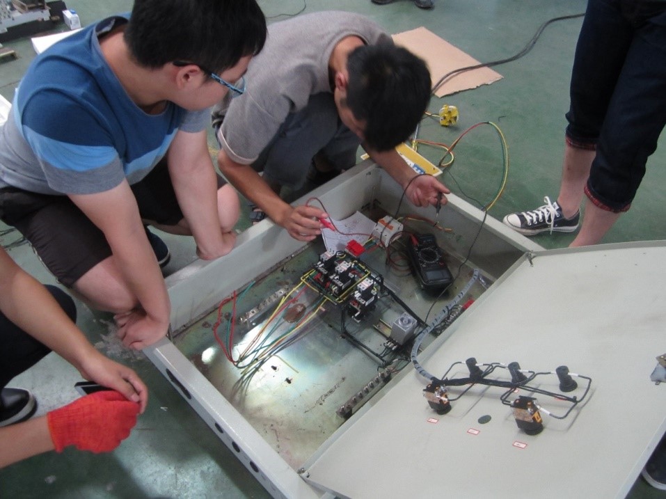 从实习的第二周起,同学们进入车间,开始自己设计电机控制电路,并完成接线。看着布线整齐、功能正常的作品,同学们开始对“学以致用”有些感悟了。