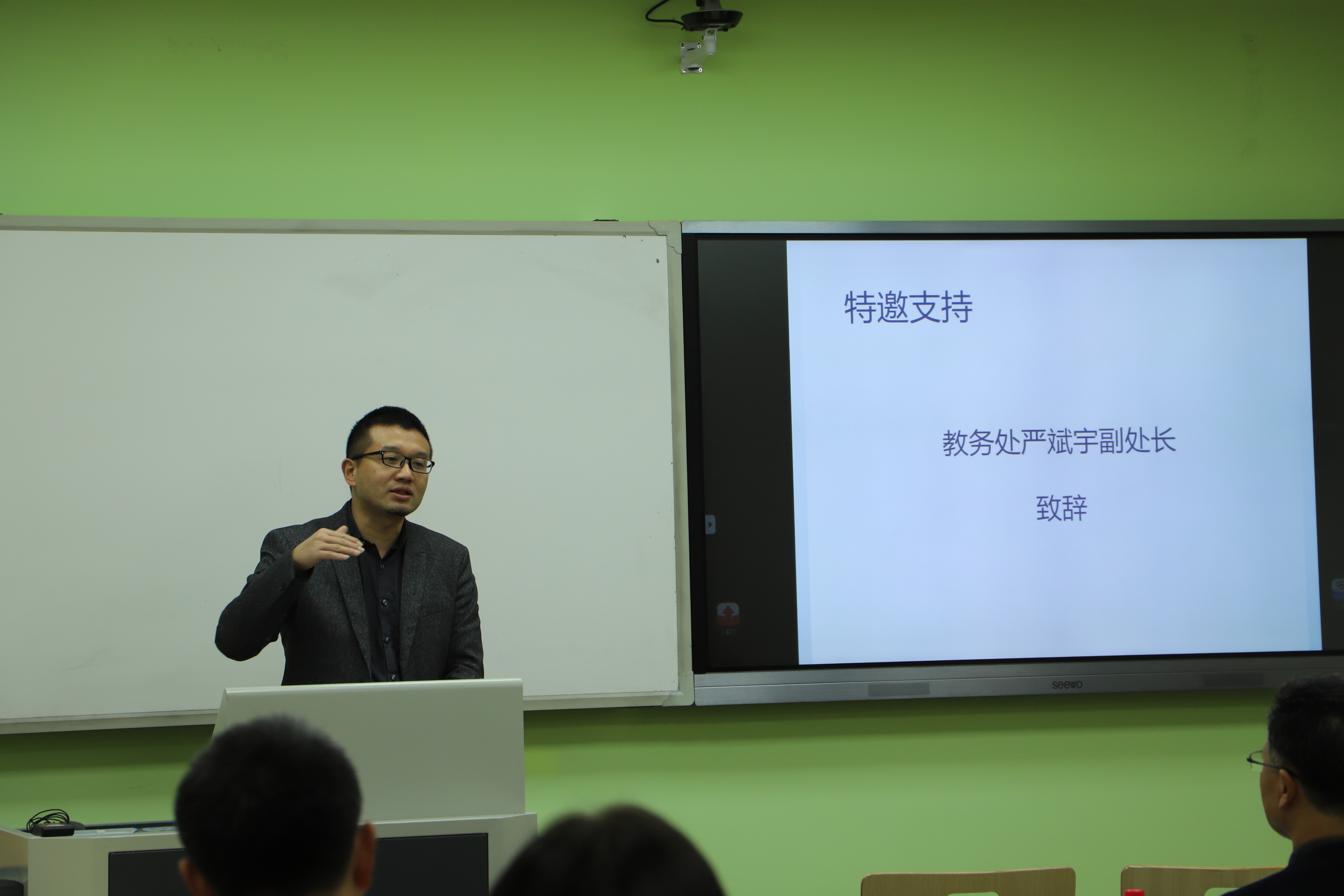 比赛由分管副院长李长松主持。他首先强调了此次比赛的背景和意义,并代表学院向评委及参赛教师对我院本科教学工作的重视和支持表达了诚挚的感谢。教务处张红伟处长特别委托严斌宇副处长来到比赛现场并讲话。严处长回顾了学校教学竞赛的发展历程,介绍了本次教学竞赛“基于不同类型智慧教室的‘探究式-小班化’教学创新”的主题,并预祝今天的教学竞赛取得成功。