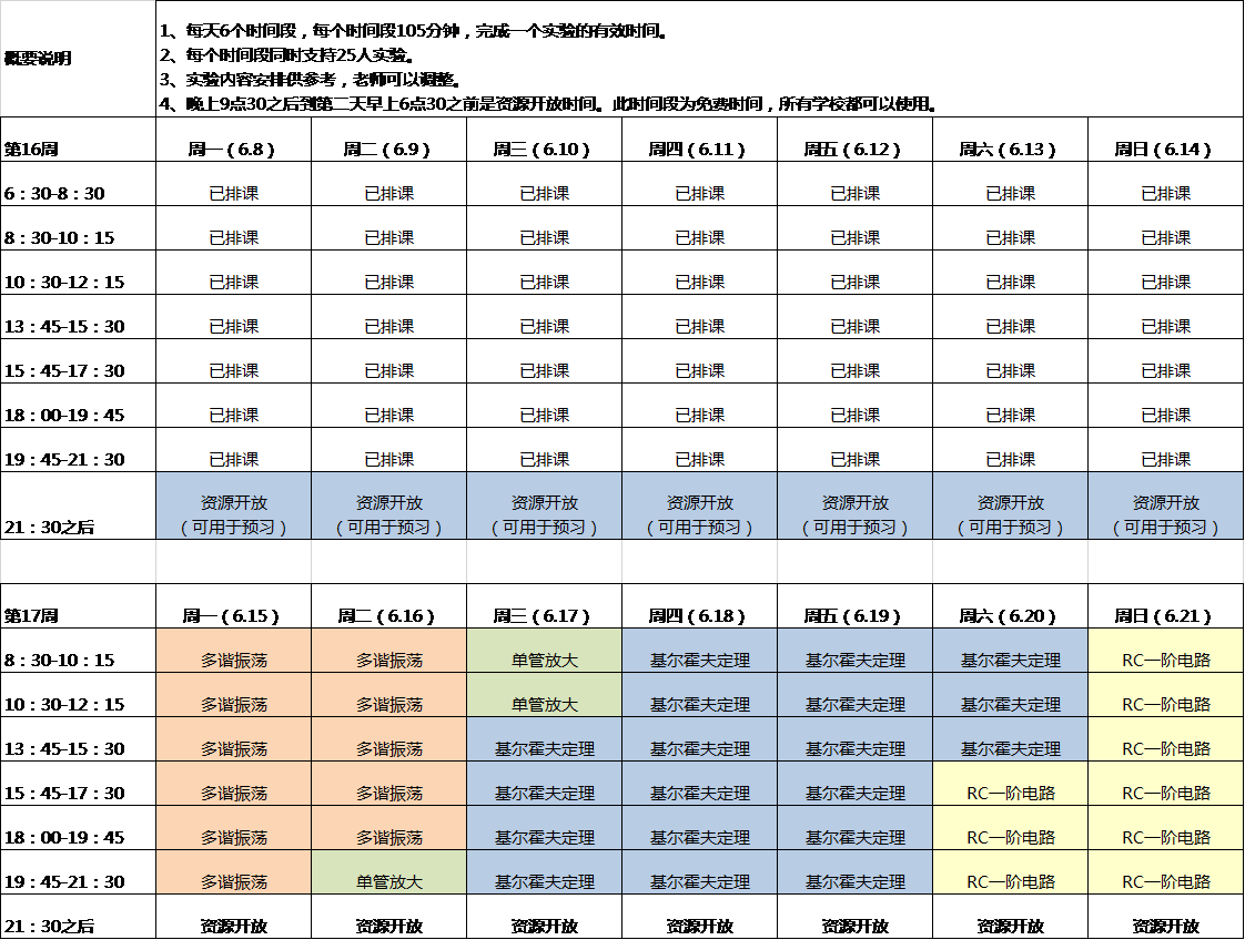 电工电子基础教学实验中心远程实物实验安排表(局部)