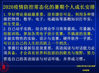 李小根老师首先对抗疫勇士们表达了诚挚的敬意,又给同学们展示了世界上还有很多地方并不平静饱受战乱,很多人生活困难,甚至难以温饱,我们之所以可以幸福的生活学习,是因为有人为我们负重前行。“有国才有家,家是最小国,国是千万家。”是对爱国精神的真实写照。接着,李老师为同学们提出了疫情防控常态化下暑期个人成长安排的建议。对同学们提出六点要求,包括学好理论基础、勤于动手实践、掌握英语阅读与对话能力、大胆尝试与创新、充分利用国内外资源和合理安排时间,给同学们合理高效利用暑假时间提供了指引。