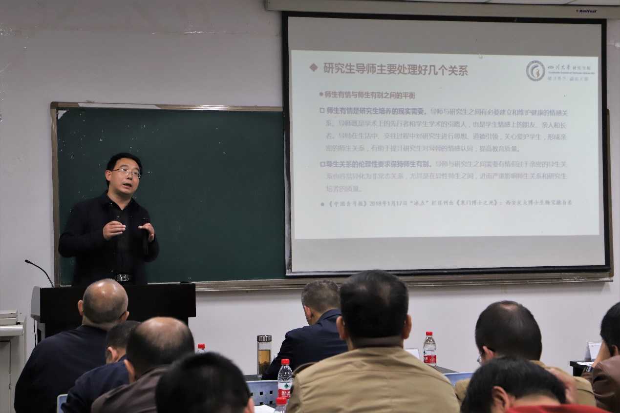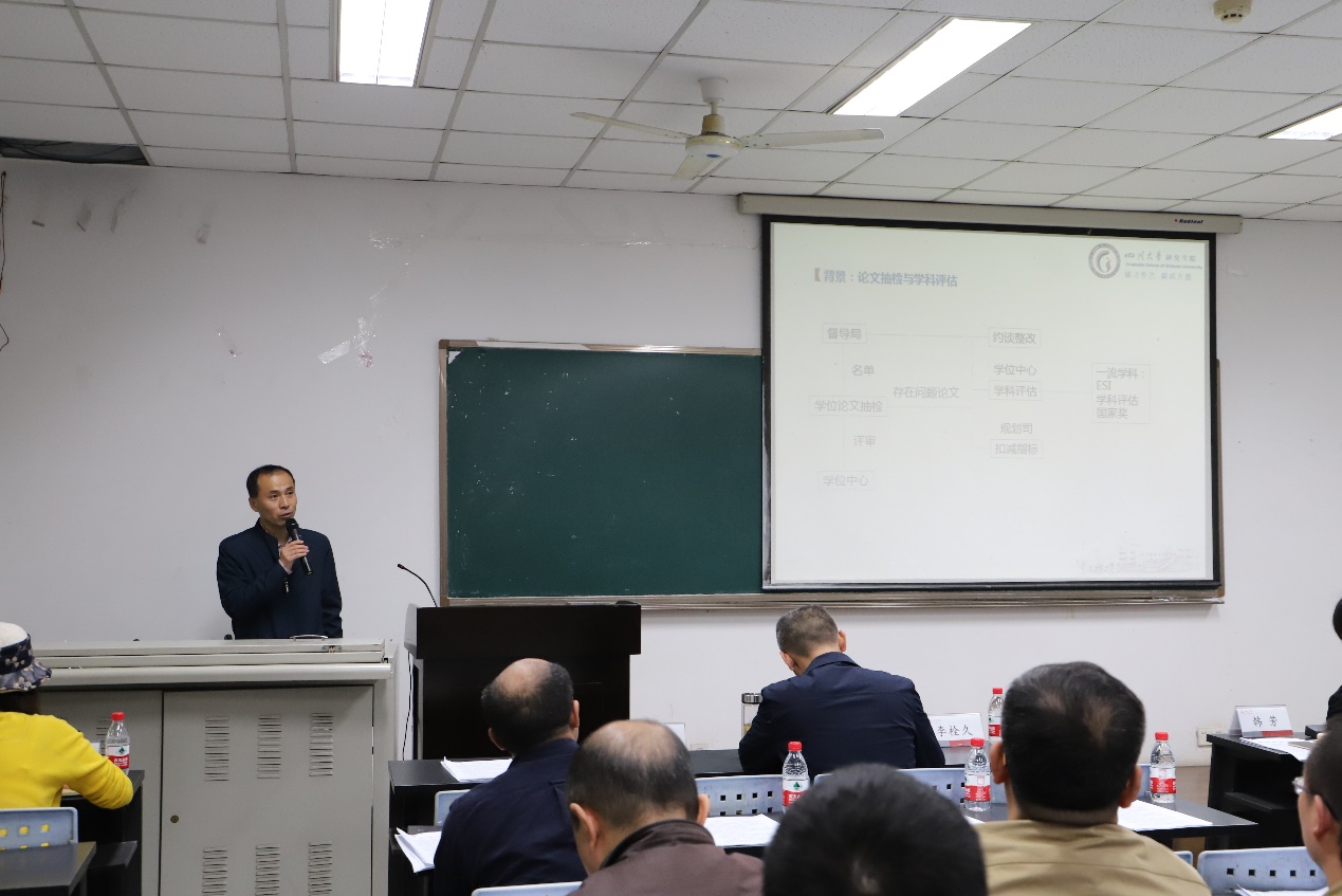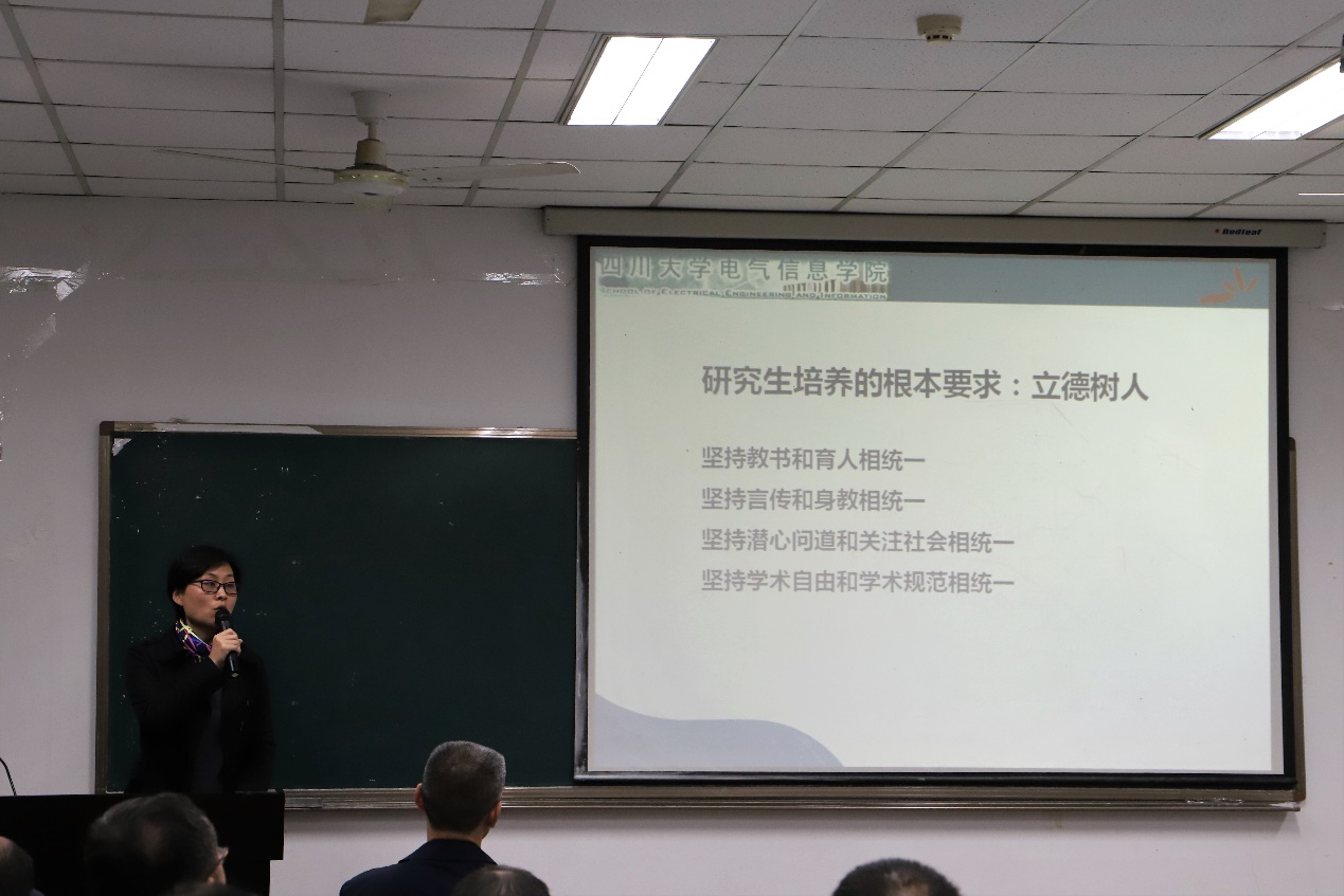 望江校区基础教学楼B座104室举行。校研究生院副院长兼研究生工作部部长李栓久、校研究生院副院长赵红军、校研究生院学位与教育教学改革办公室工科学位分管老师陈敏、电气信息学院党委书记韩芳、学院院长肖先勇、党委副书记兼纪委书记张英敏、党委副书记戴婷婷、副院长吕林出席本次培训会。电气信息学院各专业研究生导师40余人到场参加培训。