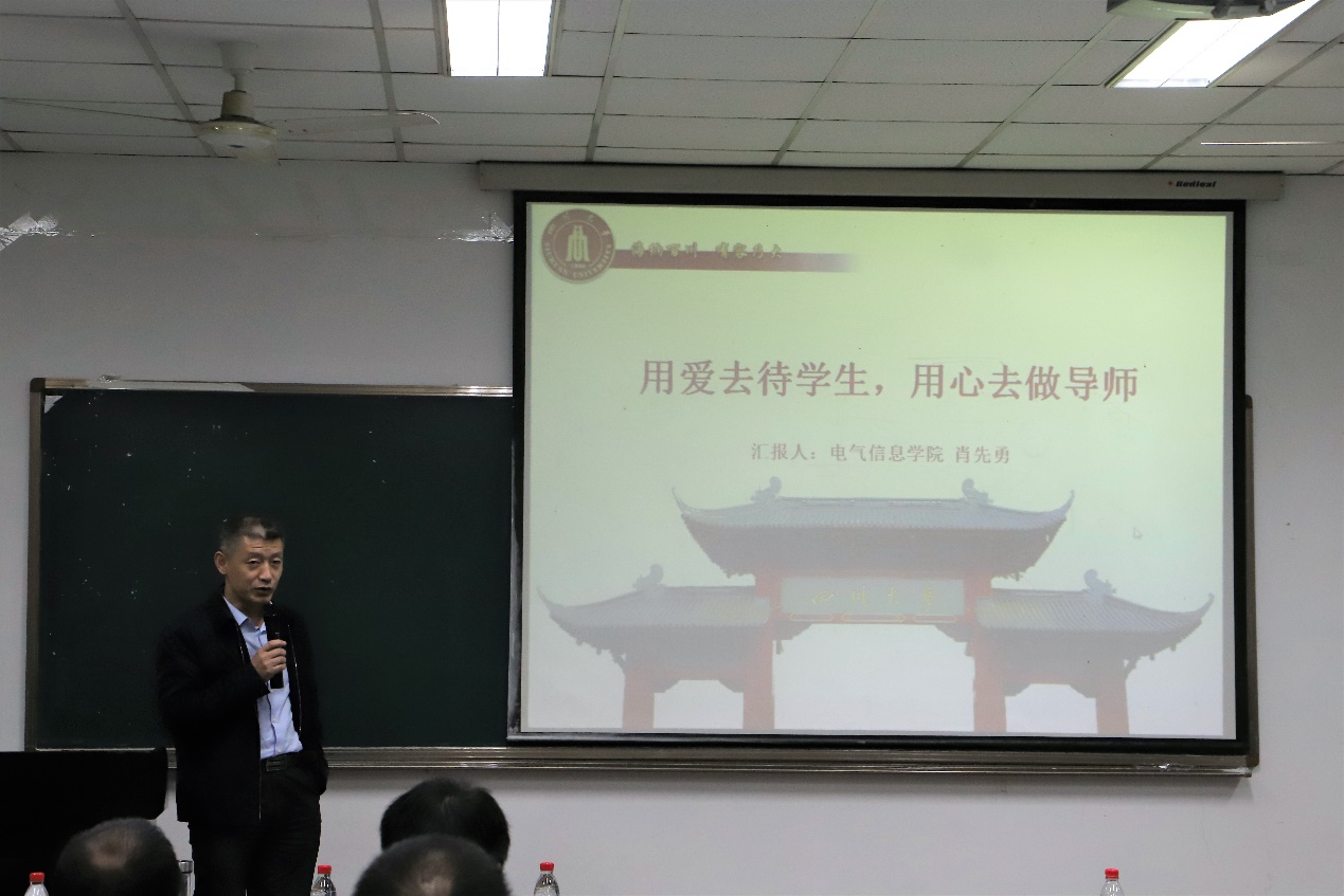 随后,电气信息学院肖先勇院长进行发言。他强调,研究生导师是造化人才的灵魂工程师,自己十分重视“研究生导师”这一身份,时刻提醒自己要以身作则、言传身教。肖院长提出,研究生导师作为引领本科生跨越至学者的关键人物,应当全方位帮助研究生提升各方面的能力,注重细节把控、强调规范,并将规范融入到日常学习工作的方方面面。他希望研究生导师们应具备“坚持”和“真心”,做到发自内心地关爱学生,对待学生既要严格也要慈爱,最大程度引导、激发学生的潜能。