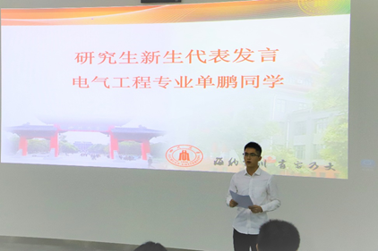最后,电气工程专业的单鹏同学代表新生发言。他就自身为期一年的大凉山支教经历分享了自己对教育及学习的思考。他表示,作为川大的研究生,在享受深厚的文化底蕴并汲取知识的同时,需不断开拓进取、孜孜以求,不断提升自我价值,依照国家“德才兼备的高品质人才”需求,不言弃、不畏惧,勇往直前,力争成为“明大德、有实力”的复合型人才。