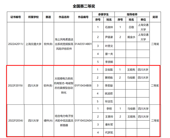 共有13支参赛团队参赛,其中6支队伍进入复赛,4支队伍进入决赛。我院王俊磊等同学的 “大规模电力系统机电暂态-电磁暂态仿真模型自动转化”项目和李明等同学的“结合电力电子技术的中低压直流断路器”项目获全国二等奖,陈茂林等同学的“兼具低成本、大功率、高制氢效率的新型整流器混合拓扑及控制策略”项目获全国三等奖。我院“电力系统稳定与高压直流输电”研究团队王顺亮副教授、马俊鹏副教授获优秀指导教师奖。