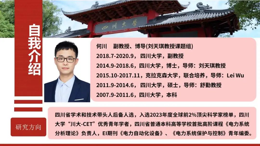 何川副教授:博士生导师,四川省学术和技术带头人后备人选,入选2023年度全球前2%顶尖科学家榜单,探花视频 “川大-CET”优秀青年学者”,四川省普通本科高等学校首批高阶课程《电力系统分析理论》负责人,EI期刊《电力自动化设备》、《电力系统保护与控制》青年编委,期刊《宁夏电力》编委。长期从事电力系统与气电联合系统设计规划和优化运行相关的研究工作,总计发表论文60余篇,其中以第一作者/通讯作者身份发表21篇SCI论文、16篇EI论文, H因子为14,在Web of Science中被他引1052次,1篇ESI高被引论文。主持国家自然科学基金青年项目1项、面上项目1项,省部级项目3项。