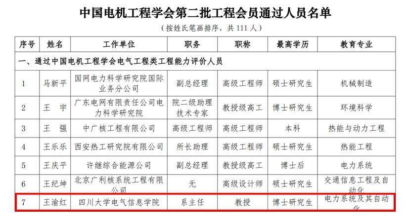 近日,我院电气工程系王渝红教授通过了中国电机工程学会第二批工程会员评价认证。