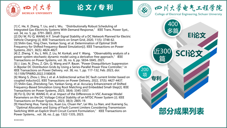 团队深耕细作,刻苦钻研。研究领域包括:电力系统分析与稳定控制、特/超高压直流输电、柔性直流输电、新能源交直流混联电网稳定性分析控制及AI应用、电力系统优化调度与规划设计、综合能源系统建模、新能源并网电力电子变流器建模及控制、先进电力储能技术等。团队承担了包括国家重点研发计划、863计划、973计划、国家自然科学基金、国家科技支撑计划项目等50多项国家级、省部级纵向项目,总经费超过2000万;和国家电网公司、南方电网公司以及各省网公司及设计院等单位合作近200项协作项目,总经费超过1亿元。团队有效服务国家能源战略需求,推动清洁能源的高效开发和利用,占领直流电网领域学术高地,推进先进直流输电技术在工程项目中的应用,积极为经济社会事业作贡献。团队研究成果应用于世界首个柔性直流电网工程——张北柔性直流电网工程、两个世界级特高压混合直流输电工程——乌东德送电两广直流工程和白鹤滩混合级联直流送出工程、多个省级电网;出版近20本中英文专著,1本译著,发表SCI论文近300篇,EI论文400多篇,高被引论文多篇,获得专利200多项;获中国电力科学进步奖一等奖,中国电力创新奖一等奖,全国优秀工程咨询成果一等奖2项,省部级奖9项,电力科技进步奖2项,其他科技奖励5项。