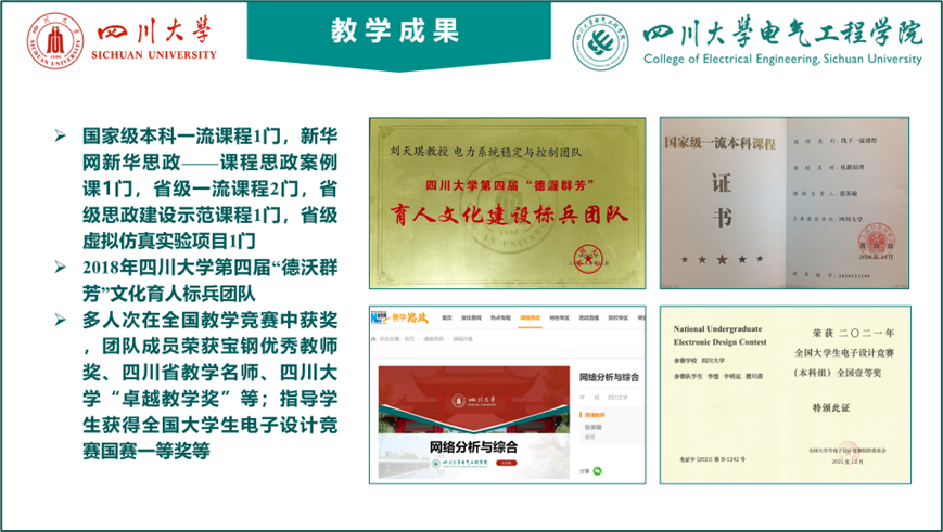 “卓越教学奖”、“姜维平优秀教学奖”和“五粮春青年教师优秀教学奖”、唐立新教学名师奖等;主持1门国家级线下一流本科课程,1门新华网新华思政平台案例课,1门省级课程思政建设示范课程,2门省级一流课程和1门省级虚拟仿真实验项目;编写规划教材10余本;主持多项省部级、校级教学改革课题,参与两项教育部新工科项目(一项结题优秀)并多次获省、校级教学成果奖。