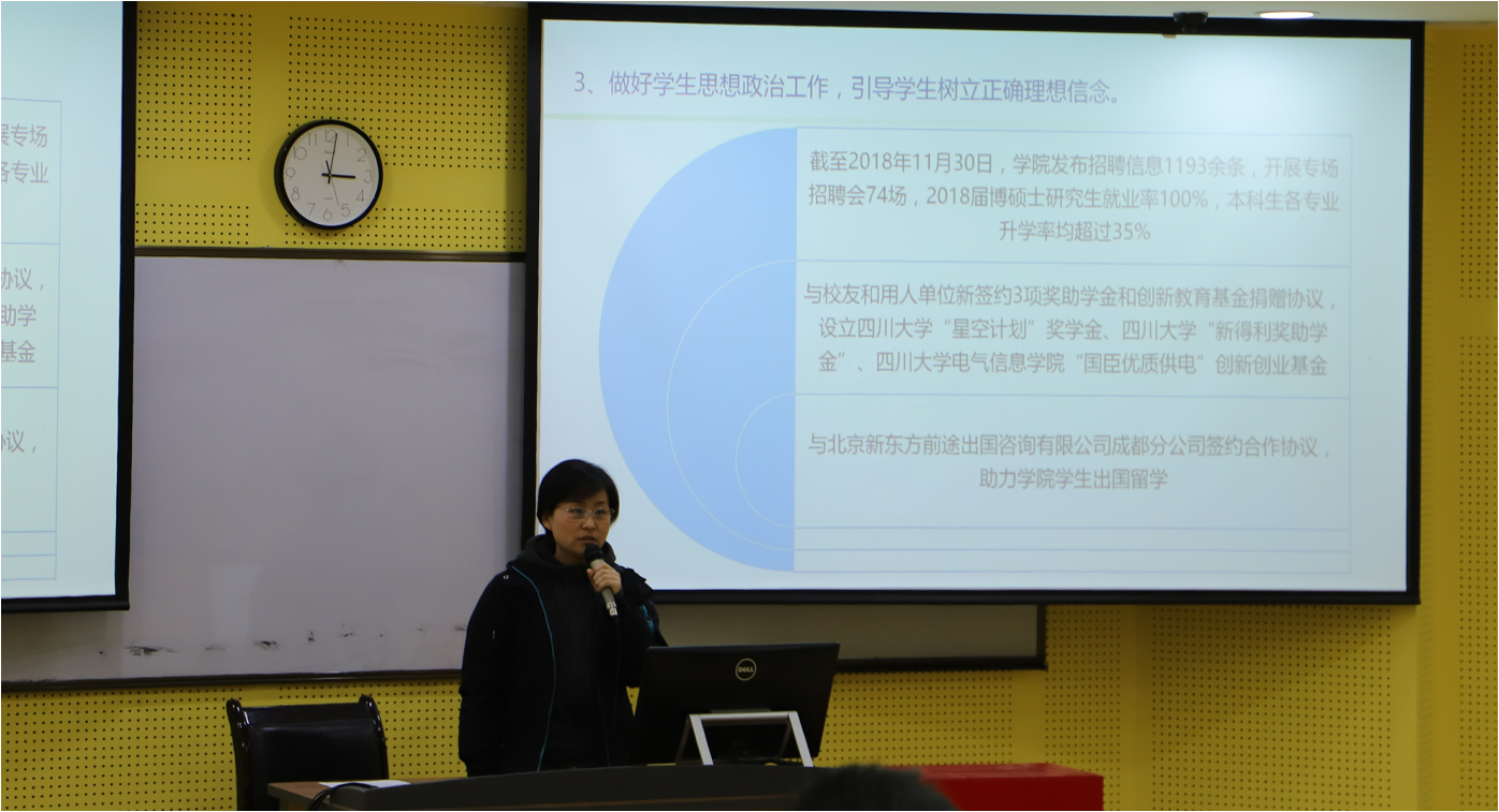 接下来,院长肖先勇对照2018年度的目标任务进行了工作总结和岗位述职。肖先勇院长分别从师资队伍、人才培养、科研学科、国际合作、实验室建设、招生就业六个方面,总结了学院取得的成绩,感谢全院老师的全力拼搏。