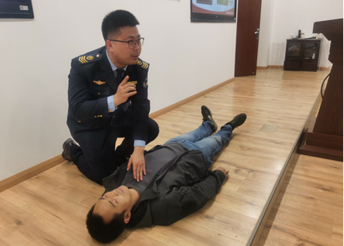 负责实验室安全的罗江陶老师与王教官一起为大家演示了身边人员突发危险时的紧急抢救方法和措施。在王教官的热情宣讲下,党员老师们不由自主地跟随教官一起“动”了起来,模拟施救过程和抢救动作。