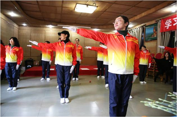 自动化系的老师们带来了第七套广播体操的表演,他们身着和中国体育代表团领奖服相似的服装,走到哪儿都非常引人注目。