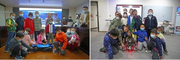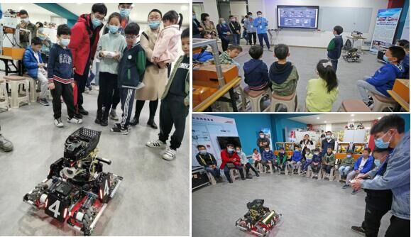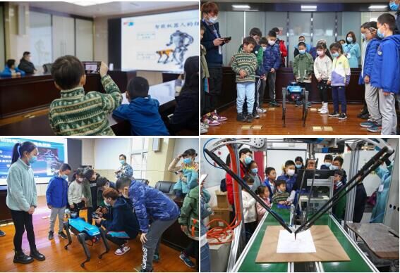 火锅战队参加“全国RM机甲大赛复活赛”的精彩视频,再现了RM机甲大赛的立体化战斗场面。在参赛同学的讲解下,小朋友们明白了比赛规则,理解了机器人的各项运动功能。随后,工作人员邀请了部分小朋友近距离接触4号战斗机器人,并进行了简单操控。现场不断爆发出孩子们惊叹声和欢笑声,在欢乐刺激的氛围下激发了科学兴趣,启蒙了科学智慧。“智能机器狗活动”在五楼能源互联网实验室开展。现场首先由研究生讲解了智能机器人的概念,目前国内外的发展趋势和应用示例。在此基础上,进行了智能机器狗Mini的现场表演。机器狗的每一次动作,无论是快速行走、跳跃障碍和原地翻滚都引起了小朋友们的阵阵喝彩。最后孩子们还亲身体验操控机器狗,感受人工智能的魅力。“工业机器人展示”环节中主要由工作人员操控三臂机器人进行绘画表演、工业机械臂的路径规划演示、四旋翼无人机展示等。