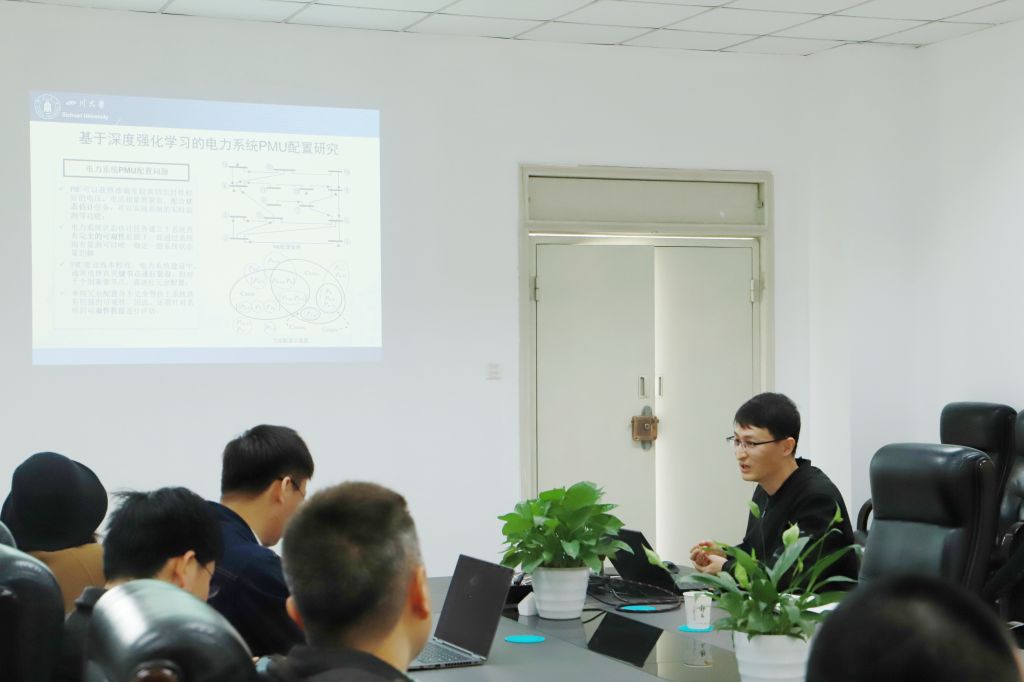 交流环节,来自三个学院的4位年轻教师从“人工智能”与“新型电力系统”两个学科研究重点领域,分别围绕《区域电网输电通道的人工智能调控方法研究》、《基于深度强化学习的电力系统PMU配置研究》、《智能电网网络与数据安全保护技术》和《面向知识支撑系统与交互系统的自然语言处理》四个专题进行了学术交流。