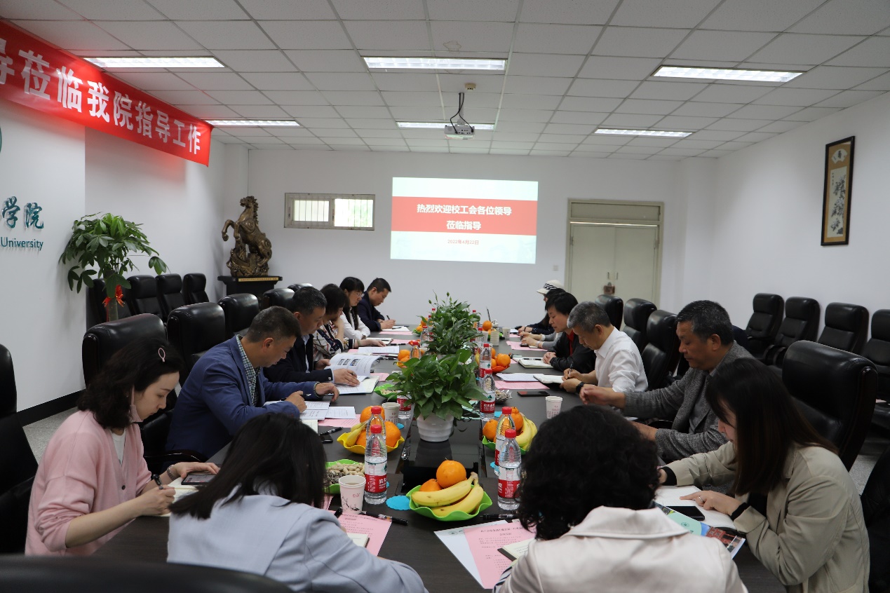 2022年4月22日上午,校工会来我院调研座谈。座谈会在学院基础教学楼A220会议室举行,参加调研会的有校工会常务副主席袁斌、副主席冷泠、副主席吕海涛及校工会相关同志。学院党委书记韩芳、院长肖先勇、党委副书记兼纪委书记张英敏、工会主席黄顺良、学院工会委员和各单位工会小组长等参加了调研会。