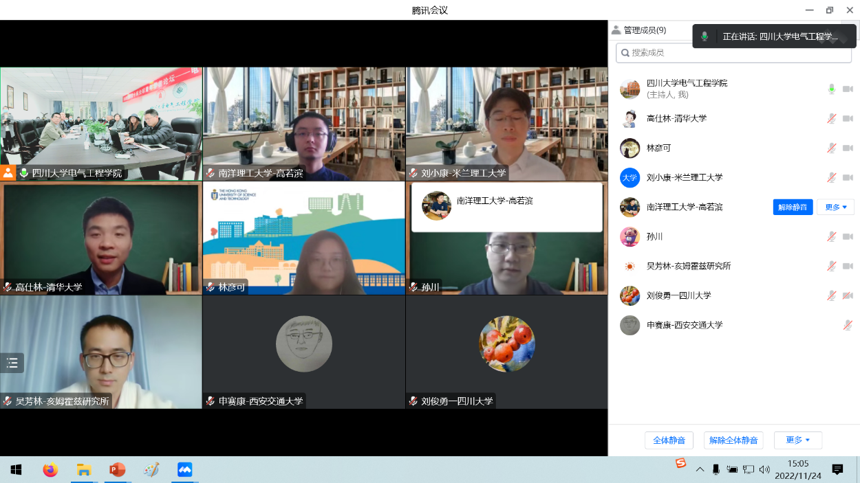 随后,青年学者们依次介绍了自己的研究领域及成果:吴芳林博士以“高能量密度锂金属电池的关键电极材料与器件”为题,重点对自己高能量密度锂金属电池体系的高镍方向、富锂方向等六项研究成果和未来研究计划作了介绍;孙川博士、高仕林博士、刘小康博士、高若滨博士、林彦可博士也分别以“双有源桥式DC-DC变换器的先进调控技术”、“大规模交直流电网全电磁暂态多尺度融合建模和仿真方法”、“电磁安全与电磁兼容基础理论研究与产业技术开发”、“时间序列预测及其应用”、“固态锂电池开发及电池安全”为题,介绍了自己所取得的学术成果和未来的研究计划。