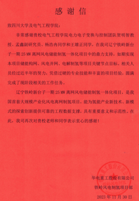 5.基于多架构整流电源的可再生能源制氢系统仿真模型软件开发服务合同,中石油吉林化工工程有限公司,结题。项目成功研发可再生能源电解水制氢系统容量配置软件,该软件已实际应用于中石油吉林化工工程有限公司承接的全球最大体量的绿色氢氨醇一体化项目—中能建松原氢能产业园项目。