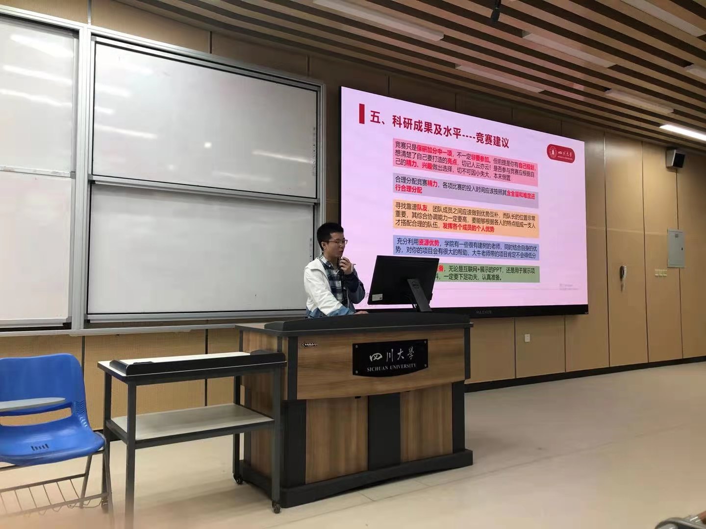 本次优秀学长交流系列活动,邀请了多位2021届本科生介绍各自在校经历,并从不同维度为低年级本科生的学习深造提出建议。陈池瑶重点围绕专业课程学习分享了自己的保研经验,强调了大学四年中各门必修课的重要性,同时她根据自身成长轨迹,建议学弟学妹们多参与各类学术活动。保研学长秦玉文认为“学习成绩是基石,课外活动是舞台”,他结合自身科研经历,建议同学们应该多尝试参加学术竞赛,同时他也围绕论文写作等分享了自己的心得。获得推免保研本校的陈毅鹏,则结合本届保研的具体过程,从保研政策、个人申请材料准备、导师的选择与联系等方面进行讲解,并对本学院部分科研团队的概况作了介绍。伍彦豪结合自己在川大的求学经历,对深造选择问题进行了分享,并建议低年级同学们要早定目标、早做准备。已获得境外高校offer的边彤,则着重从出国准备、国家选择、学校申请等具体方面展开分享,为立志出国深造的学弟学妹们提出了不少中肯建议。每场交流会结束后,学长学姐都耐心对同学们的提问进行解答,现场气氛积极踊跃。