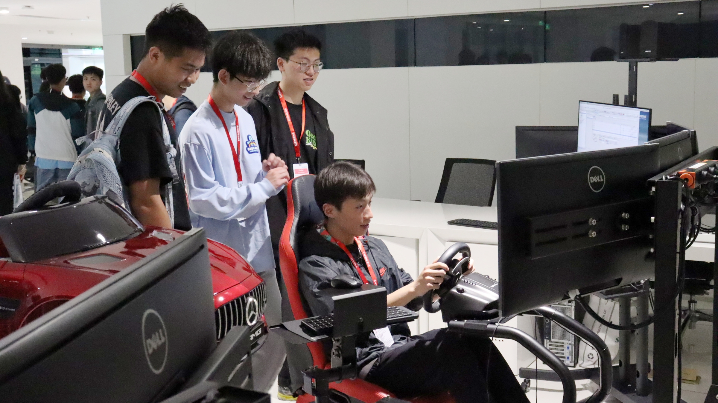 最后,在智能创新实验室区,同学们参观了高端制造装备研发实验室、工业物联网实验室、虚拟测试实验室等,并在车辆半实物仿真平台上进行了交互体验。通过与讲解员的互动问答,同学们对机电一体化、通信技术、网络安全等概念有了初步的认识,氛围轻松愉快,交流主动性高。
